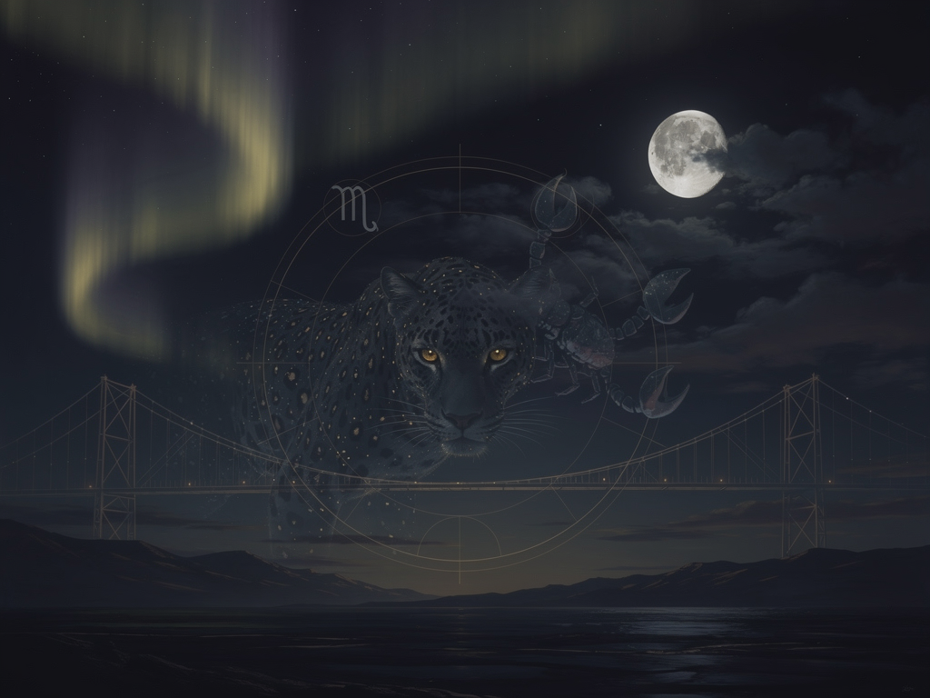 Der Mond im Skorpion beim Ersten Viertel ist traditionell verbunden mit Intensität, Fokus auf das Wesentliche und dem Aufdecken von Verborgenem – eine Qualität, die den Jaguar-Impuls des Tzolkin spiegelt.